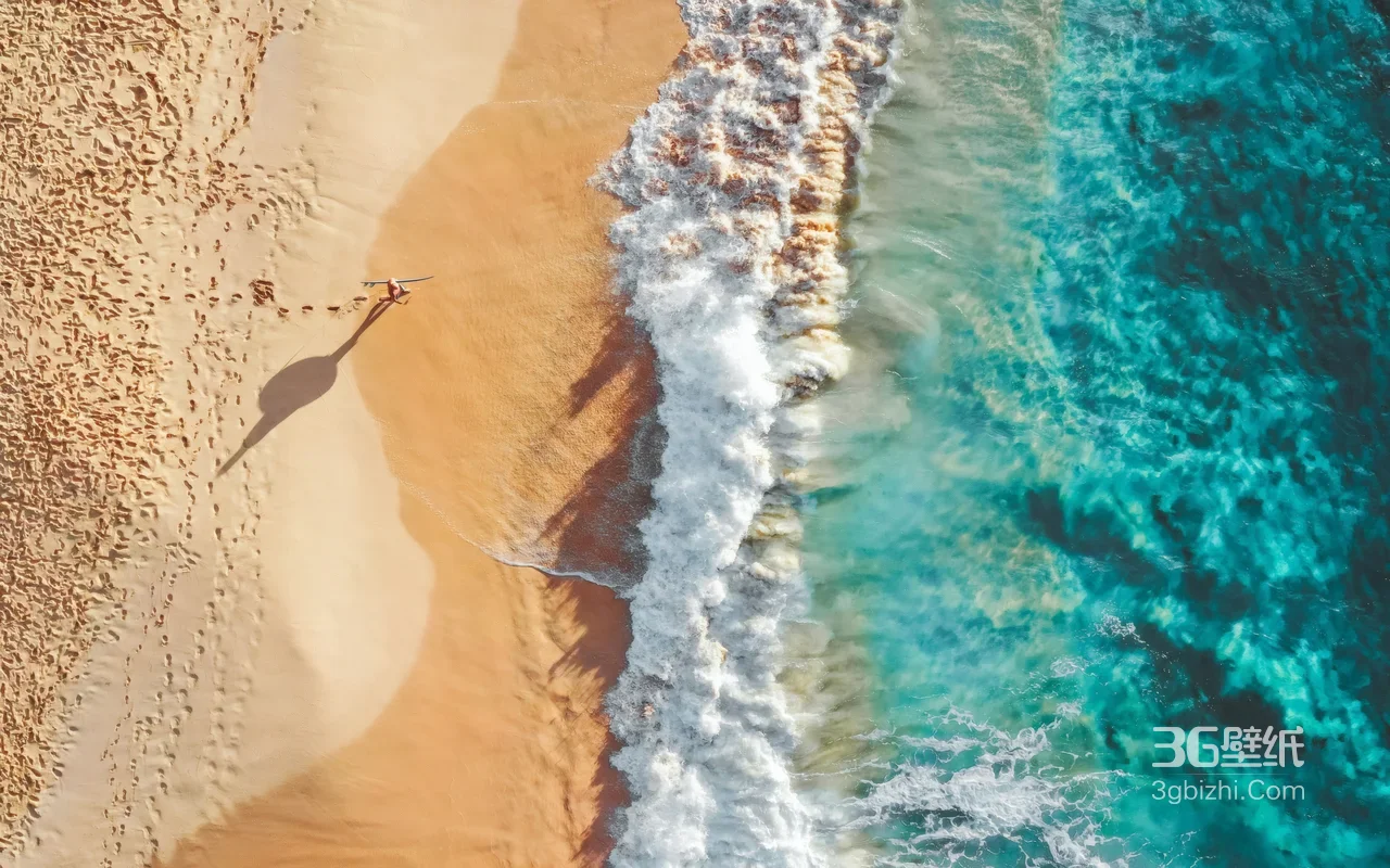 航拍海滩冲浪者 金黄沙滩蓝绿海浪壁纸